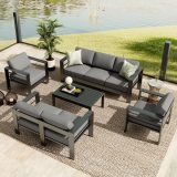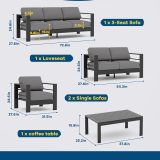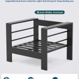 Introducing the 7 Seats Aluminum Patio Furniture Set, a luxurious 5-piece outdoor sectional conversation set designed for comfort and style in your outdoor space. This set features a spacious sectional sofa with 4″ armrests and 5″ thick cushions for ultimate relaxation. The dark grey color adds a modern touch to any patio or deck.